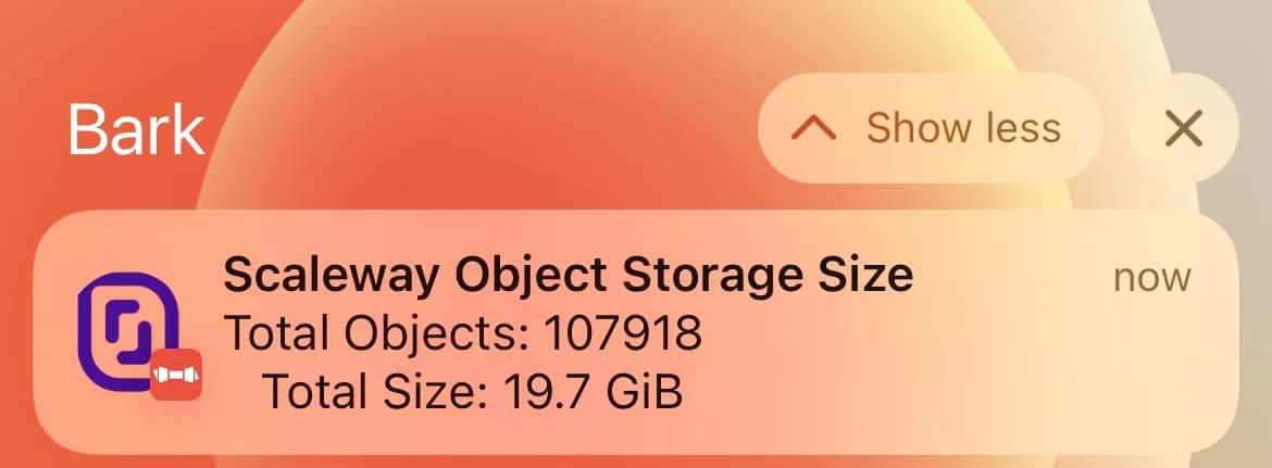 定时获取Scaleway的存储桶大小,并通过Bark每日推送到iPhone端。在存储桶过大的时候报警